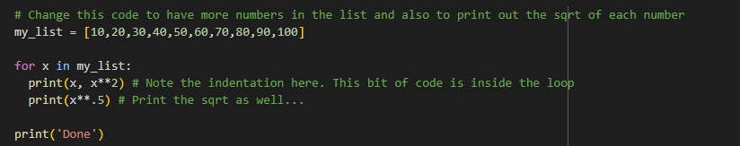 print(x,x**.5) square root the last element of the list (‘x’) which is 40 and prints “Done”