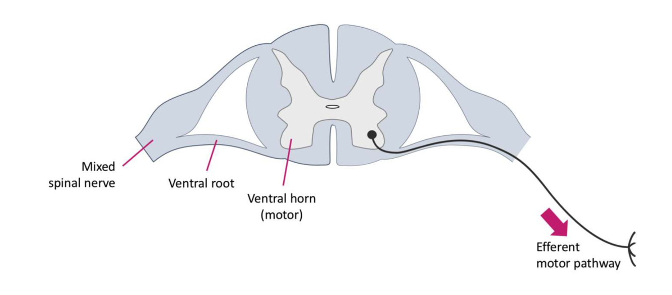 Describe the spinal motor nerves involved in muscle contraction and their pathway