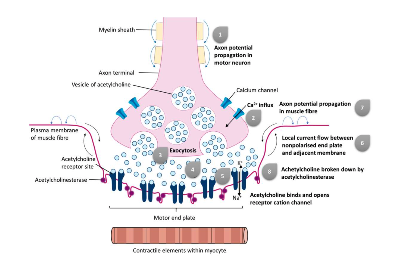 Describe the key stages of synaptic transmission at the neuromuscular junction