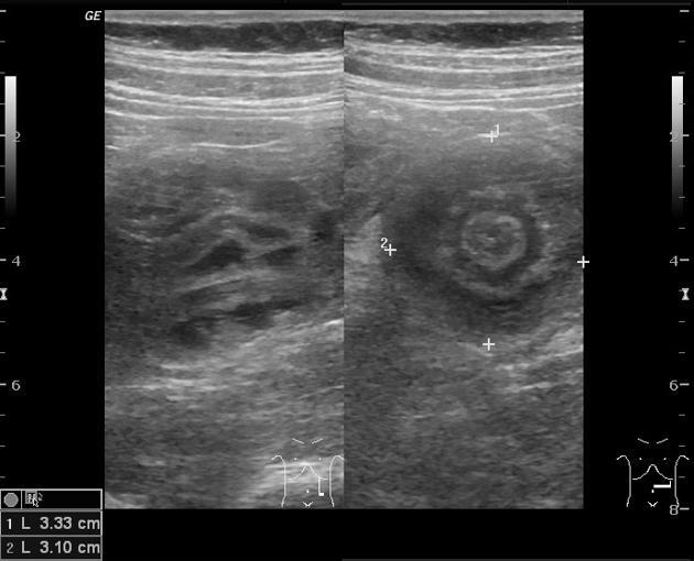 Target sign - concentric echogenic and hypoechogenic bands on ultrasound.
