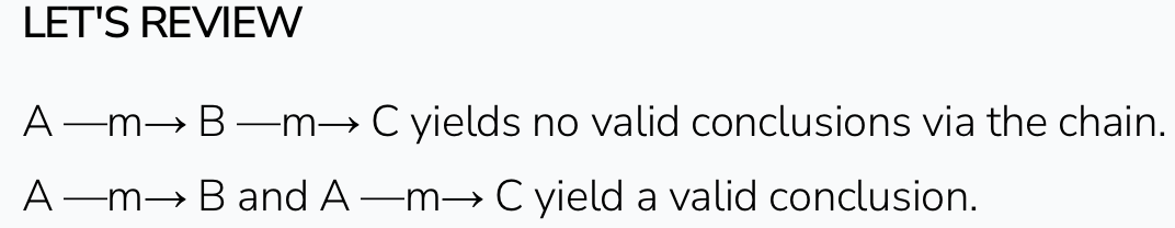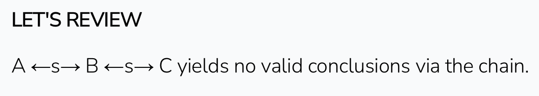 When two most statements are chained together and they do NOT emanate from the same set, there are no valid conclusions to draw via the chain.