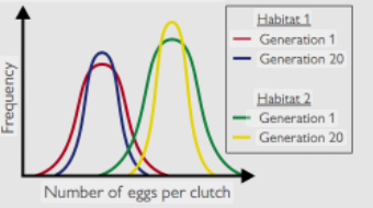 The graph on the right shows the change in frequency of different clutch sizes (the number of eggs laid) in two populations of robins across 20 generations. Describe what the data for Habitat 1 is showing. What type of selection does this data show?
