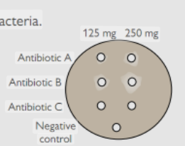 A microbiologist is researching the viability of three new antibiotics in treating E. coli infections. The diagram on the right shows a Petri dish prepared with E. coli. It has been incubated with paper discs soaked in different concentrations of each antibiotic for 48 hours.