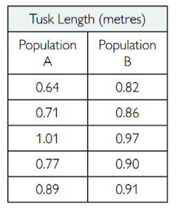 E.g. the standard deviation of population A is higher than that of population B, suggesting that the values for population A are more spread out from the mean. This indicates that there is greater variation in tusk length in population A compared to population B. However, the standard deviation for both populations is quite low, which indicates there’s not much variation in either population.