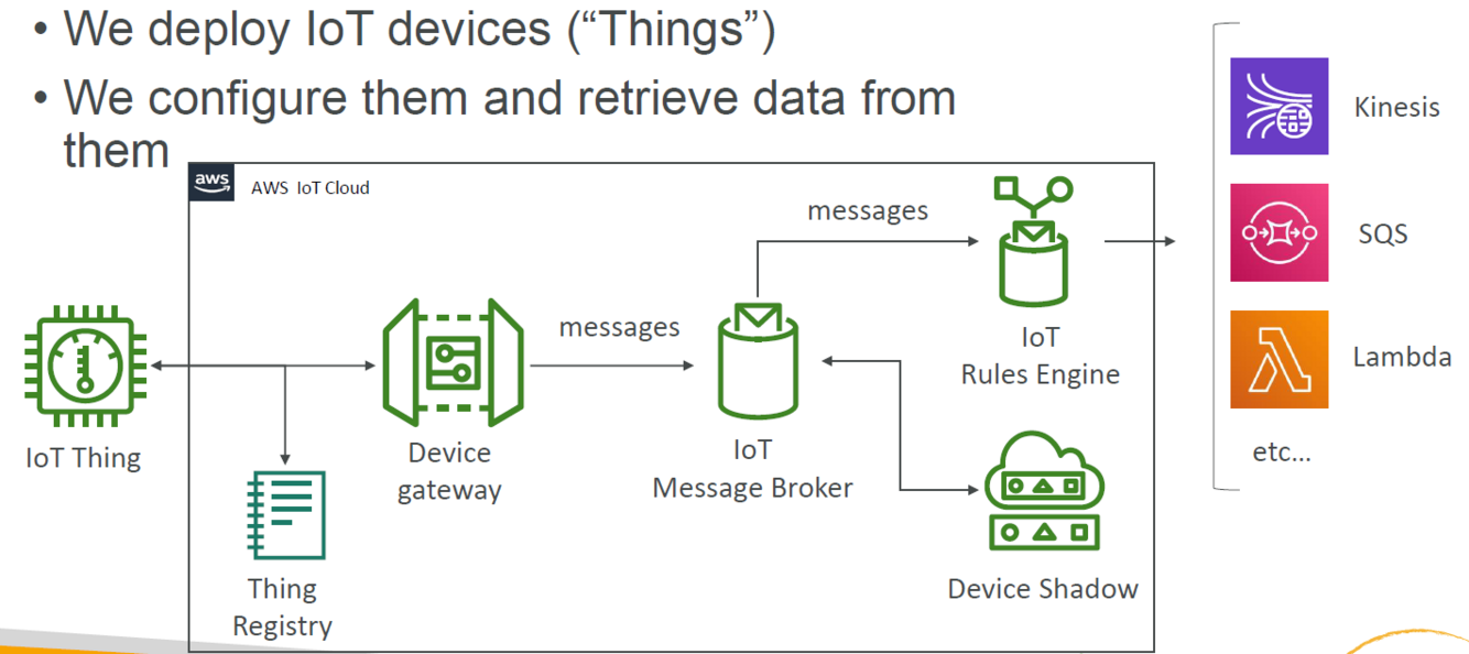 The IoT device will be registered with the AWS IoT Cloud, which includes a Thing Registry for authentication and security. Communication between the IoT device and the cloud is facilitated through a device gateway, which sends messages to an IoT Message Broker. The message broker sends messages to multiple destinations using a rules engine that can integrate with Kinesis, SQS, Lambda, and other targets. Additionally, there is an IoT Device Shadow that acts as a shadow of the device, allowing for state changes even when the device is offline. Understanding the Thing Registry, IoT message broker, rules engine, and device shadow is crucial for IoT. AWS IoT Core offers a range of services for IoT and a tutorial in the console to learn more.