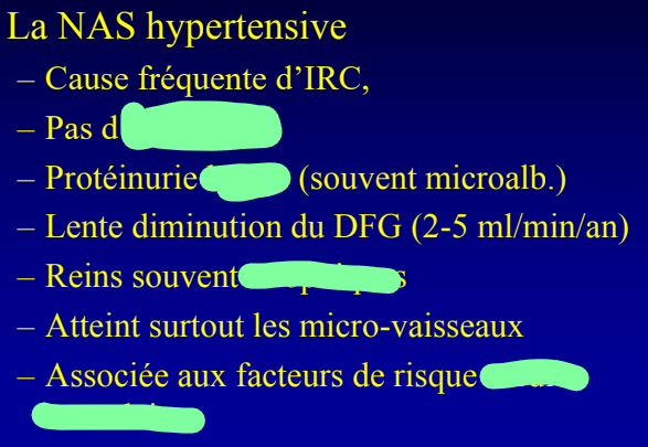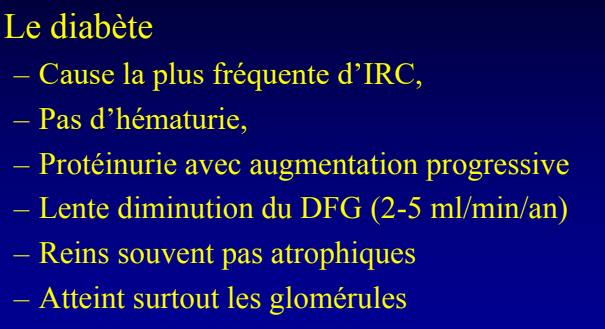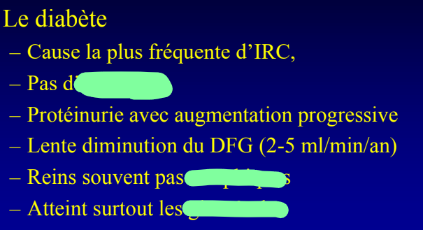 Dans la néphropathie diabétique, les reins sont de taille augmentée, contrairement à la majorité des causes d’IRC qui engendrent une atrophie rénale.