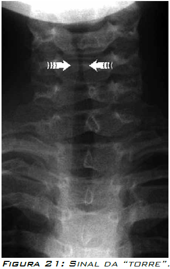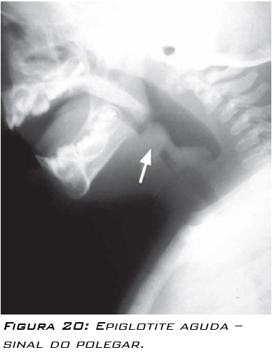 O sinal radiológico descrito para epiglotite aguda é denominado “sinal do polegar”, observado na radiografia cervical lateral, explicado pelo edema da epiglote. Este exame não deve ser solicitado quando o quadro clínico indica que se está diante de uma epiglotite aguda, pois qualquer demora na obtenção da via aérea piora o prognóstico do paciente.
