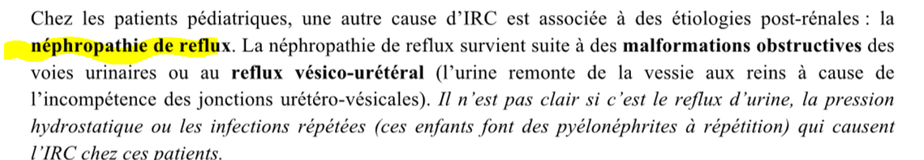 pour l’IRC POST-rénale, quelle pathologie peut etre vu chez enfant que ya pas dans ira post-rénale