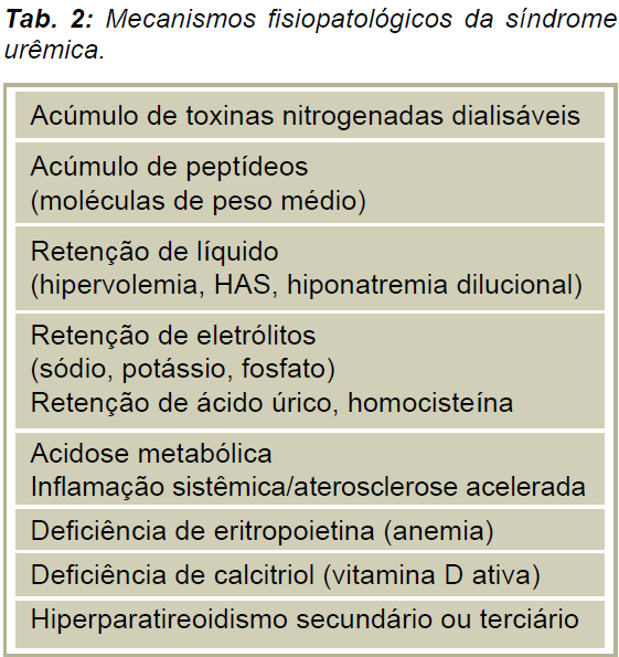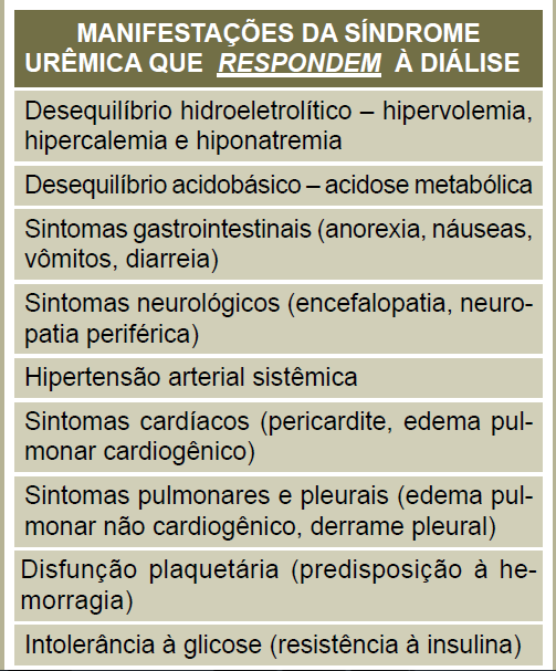 Os sinais e sintomas da síndrome urêmica costumam ocorrer com ureia sérica > 180 mg/dl, em não diabéticos, e > 140 mg/dl, em diabéticos.