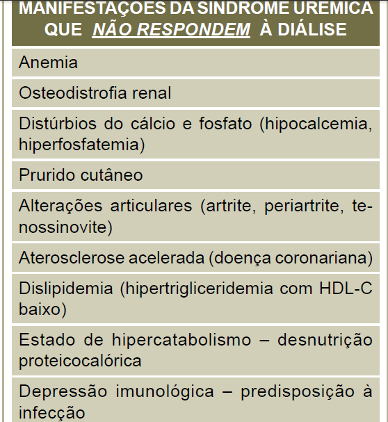 Com frequência, pacientes em programa de diálise apresentam sintomas como astenia, falta de energia, distúrbios do sono e cognição, alterações psiquiátricas, disfunção sexual e deficit de crescimento e maturação sexual em crianças e adolescentes.