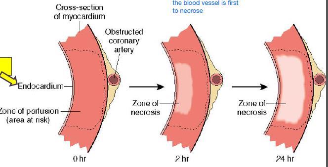 Which area of the blood vessel (in relation to the obstruction) is first to necrose?