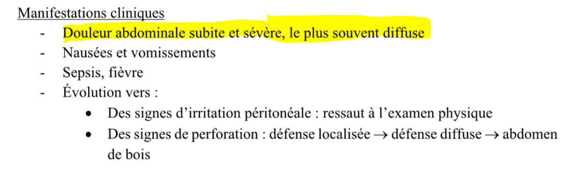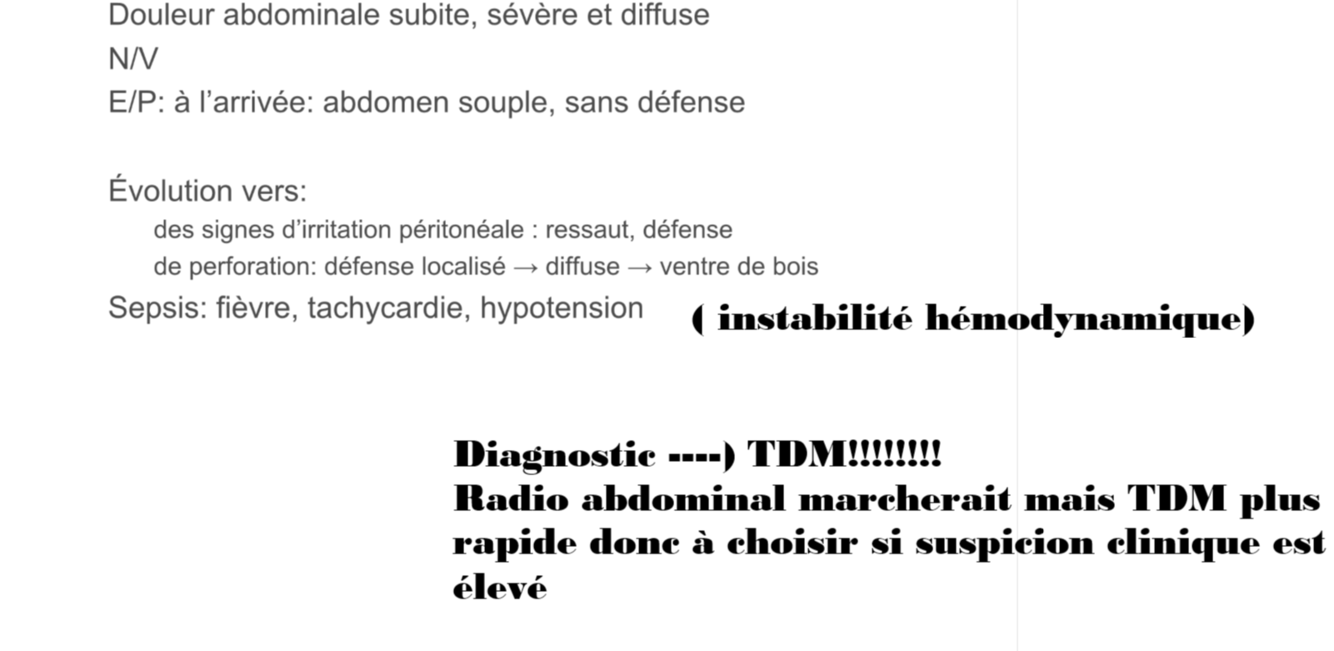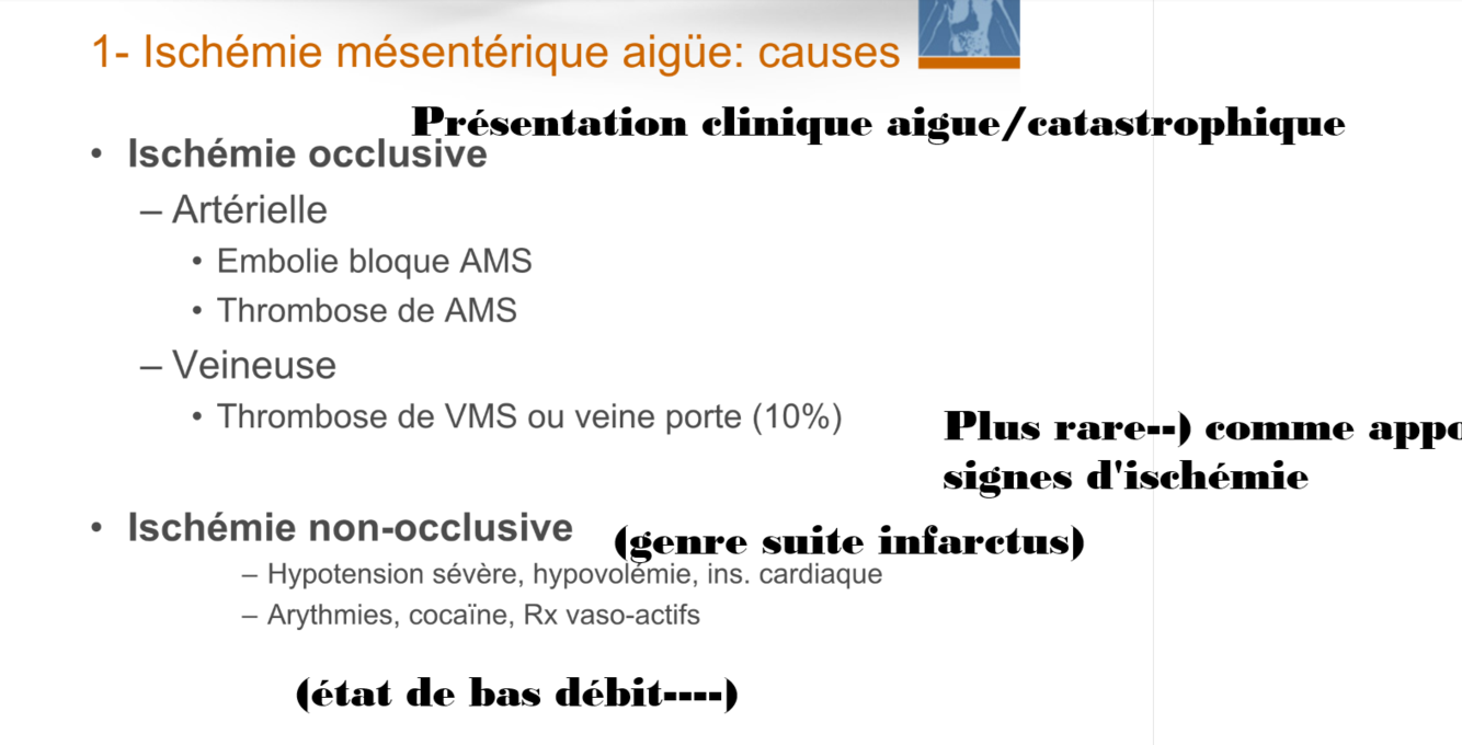 surtout l’ischémie mésentérique URGENCE VITALE avec ishémie COLLIQUE qui est a peu presl’équivalent