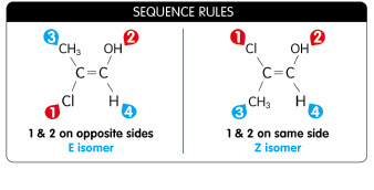 If the higher-priority substituents (“1” and “2”) are on the same side of the double bond, then the substituents are arranged in Z configuration; if the higher-priority substituents are on opposite sides of the double bond, then they are arranged in E configuration.