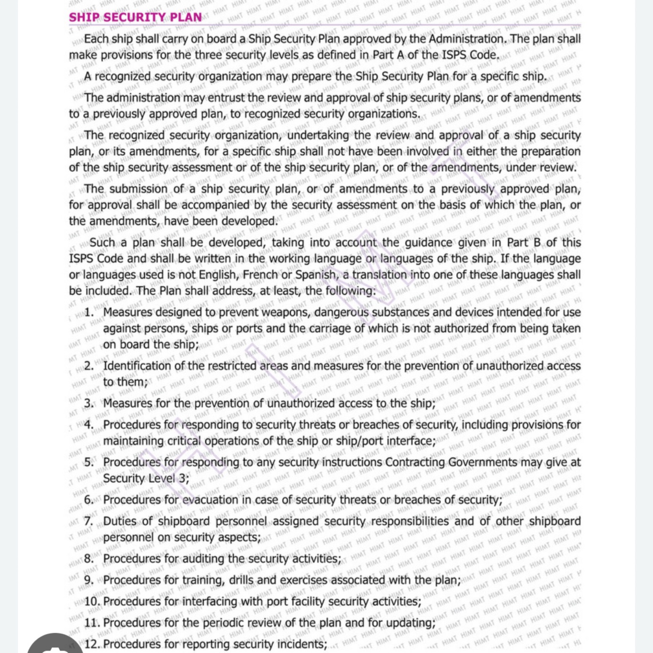 duty of crew members at different security levels and guidance for different security threats.