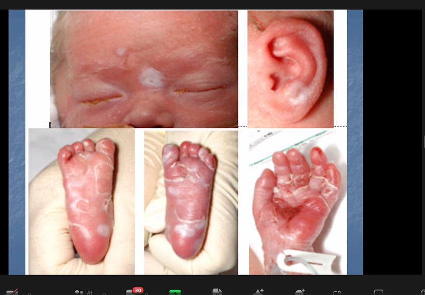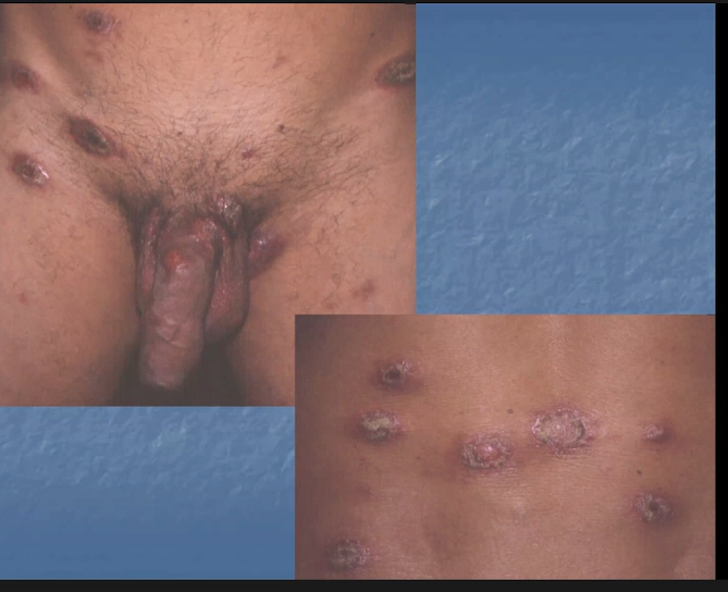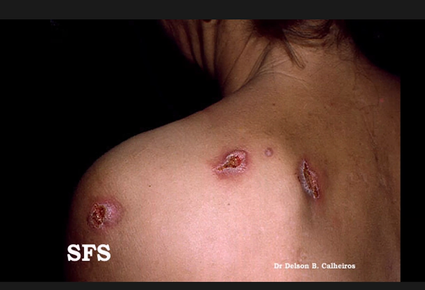 Lesão cutânea com pleomorfismo, simétrica e infectantes