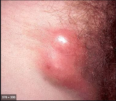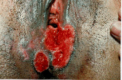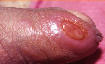 Vesículas agrupadas sobre base eritematosa, que evoluem para úlceras arredondadas e dolorosas e posteriormente crostas