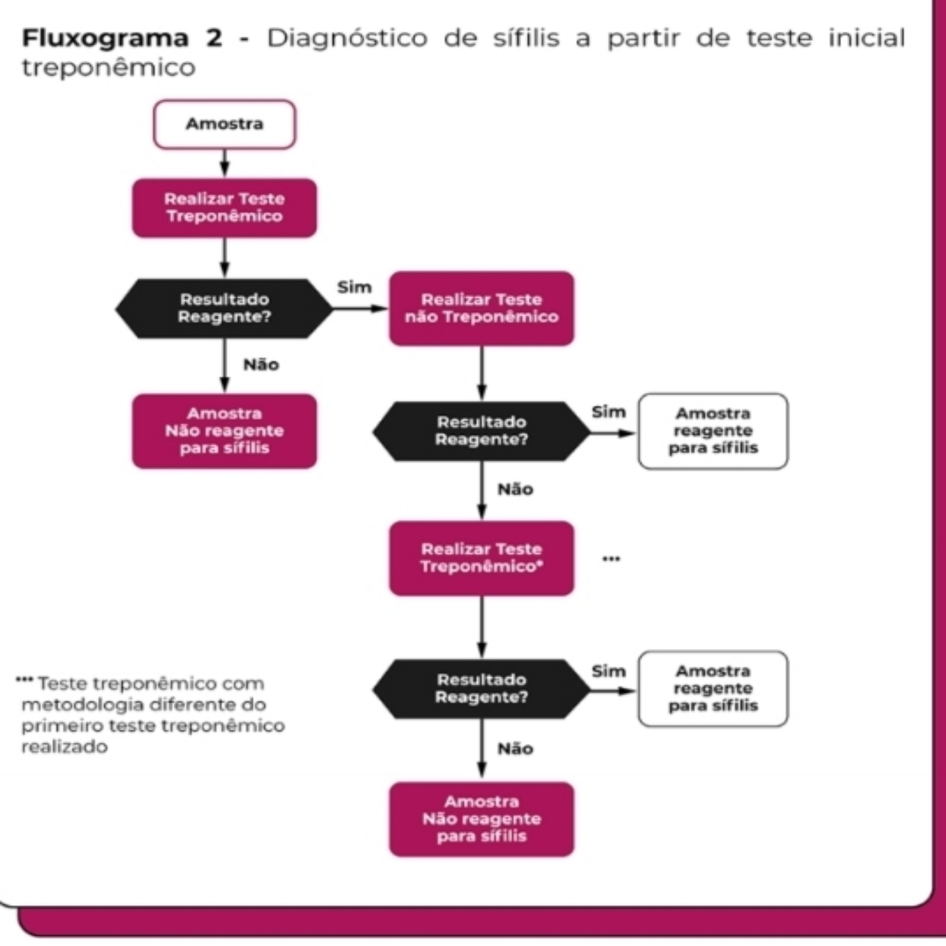 ▪︎ Em caso de teste treponêmico positivo e posterior teste não treponêmico negativo, pode confirmar o diagnóstico com outro teste treponêmico de metodologia diferente.