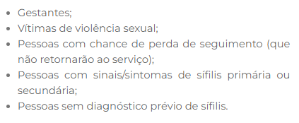 ▪︎ Teste único para diagnóstico em gestantes, abusados sexualmente, risco de perda de seguimento e sintomas característicos.