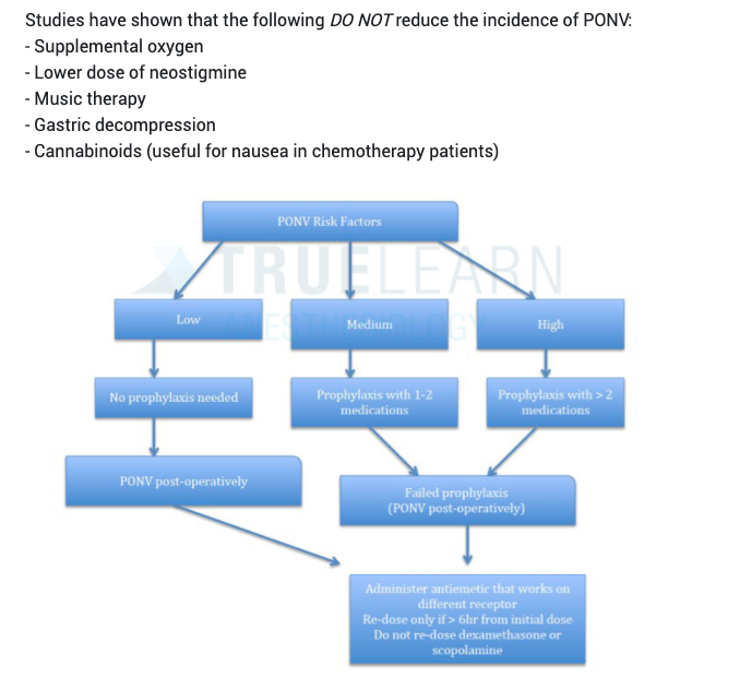 1) 5-HT3 receptor antagonist (e.g., ondansetron): commonly used in the perioperative management of PONV. Better at preventing vomiting than nausea. The recommended dose for ondansetron is 4mg at the end of the surgery. Do not re-dose unless more than 6 hours have elapsed since the last dose was administered, including in the immediate post-operative period. An adverse effect is QTc prolongation.
