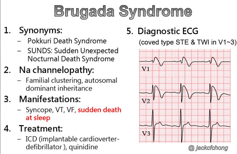 Characteristic findings are RBBB & ST elevation in V1-V3