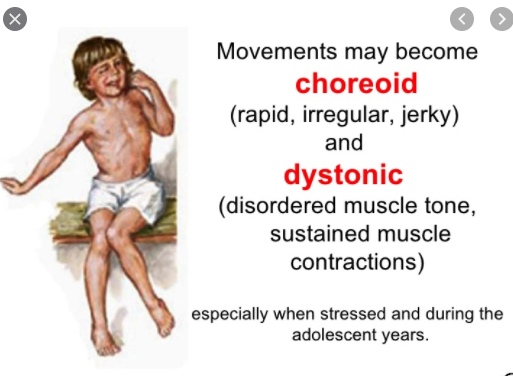 Extrapyramidal features such as choreoathetoid/dystonic movements or ataxia