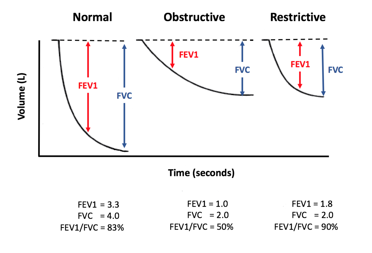FEV1/FVC ratios for normal, obstructive, and restrictive dx
