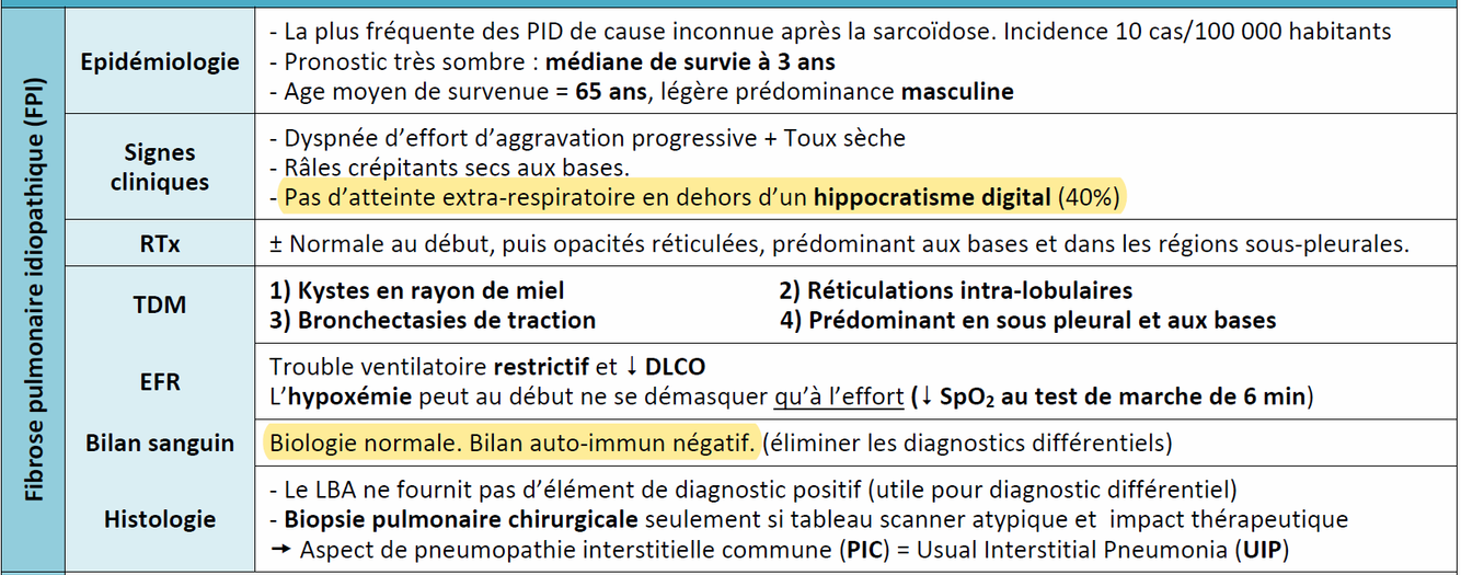 pneumopathie idiopathique : fibrose pulmonaire idiopathique, PID non spé, PID cryptogénique…
