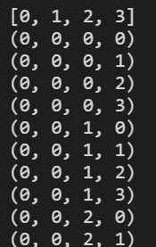 (0, 0, 0, 0) (0, 0, 0, 1) (0, 0, 0, 2) (0, 0, 0, 3) (0, 0, 1, 1) (0, 0, 1, 2) (0, 0, 1, 3) (0, 0, 2, 2) (0, 0, 2, 3) (0, 0, 3, 3) (0, 1, 1, 1) (0, 1, 1, 2) (0, 1, 1, 3) (0, 1, 2, 2)