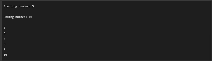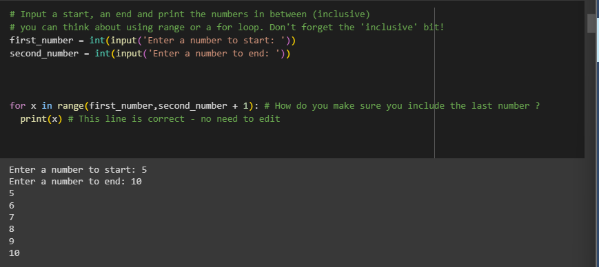Write a script which inputs two numbers. The first should be a number to count from, the second a number to count to. Once the user has input the numbers, you should print - using a loop - all of the numbers between the starting and ending number (inclusive; think carefully about this), one per line.