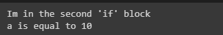 if a == 10:: This line starts the second if statement. It checks if the value of a is equal to 10. Since a is indeed equal to 10, this condition is true, and the code block below it is executed. The statements inside this if block are printed.