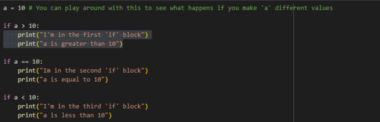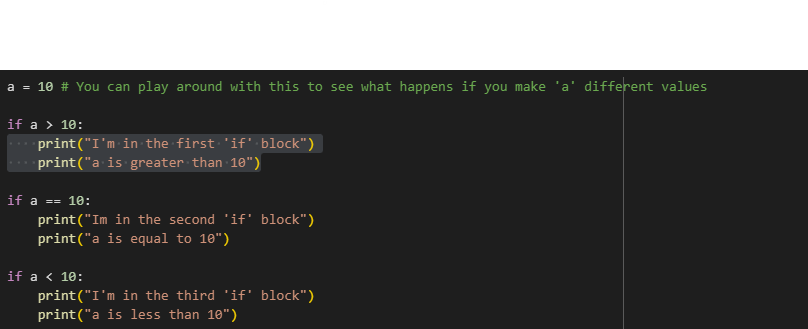 if a > 10:: This line starts the first if statement. It checks if the value of a is greater than 10. If this condition is true, the code block below it is executed. However, since a is equal to 10, this condition is false, and the code block inside this if statement is skipped.