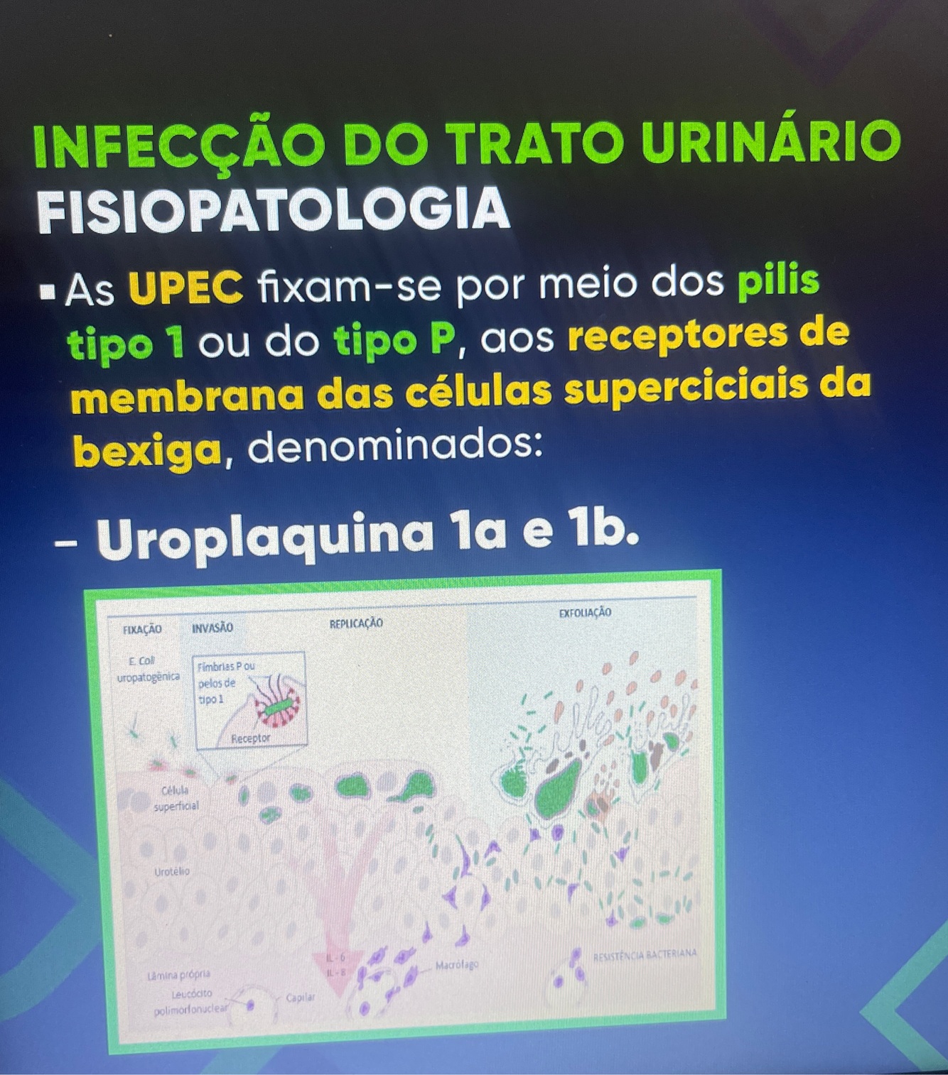 Pili ou fibrinas aderem a Uroplaquina da celula, são internalizadas as bactérias, as mesmas produzem biofilme que impedem a atuação dos mecanismos de defesa, as células sofrem apoptose, isso resulta em esfoliação de depuração das células do hospedeiro infectada