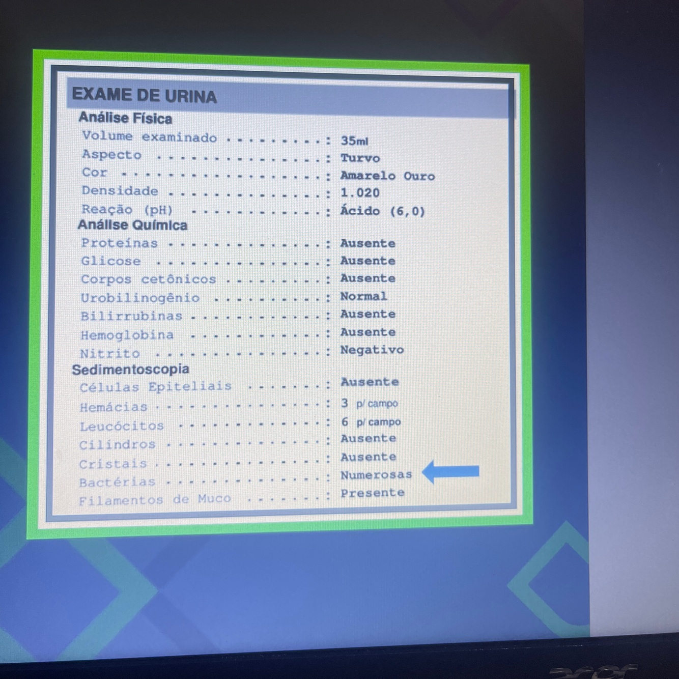 O exames de urina não agregar valor no momento do tto, a não ser que seja um paciente idoso, acamado, afásico, paciente com início de sepse, porém a ausculta pulmonar está normal