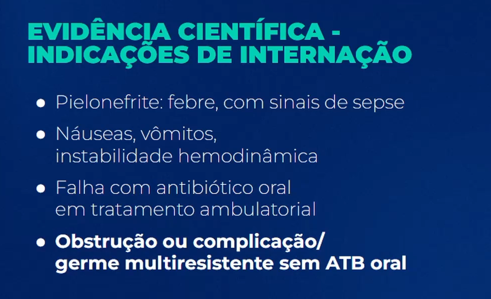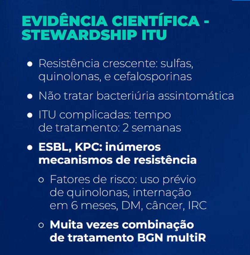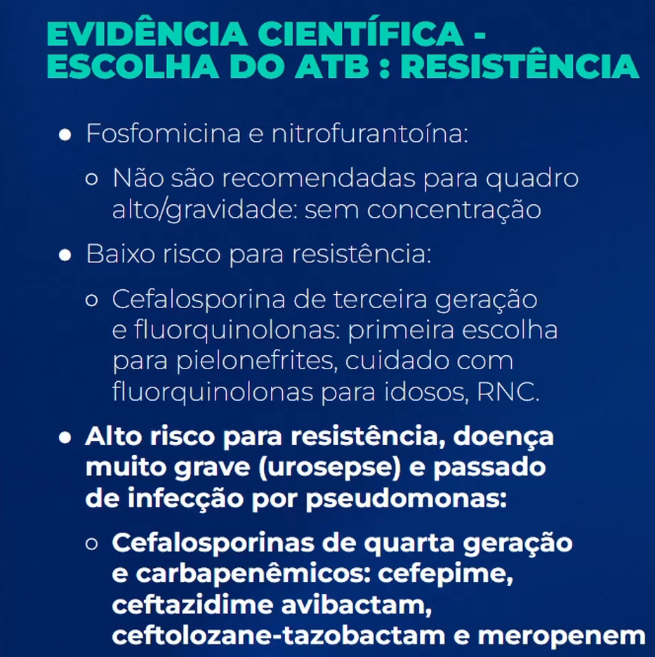 MUITAS VEZES vamos dar um antibiotico forte e quando sair o antibiograma temos que ver 2 coisas, ver se o antibiotico ja nao deve ser encerrado e se nao ver se os antibioticos descalonaveis que vieram sensiveis na urocultura sao antibiocticos que se concentram na via urinaria