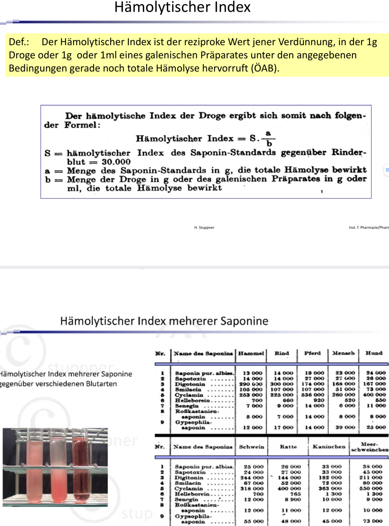 Der Hämolytischer Index ist der reziproke Wert jener Verdünnung, in der 1g Droge oder 1g oder 1ml eines galenischen Präparates unter den angegebenen Bedingungen gerade noch totale Hämolyse hervorruft