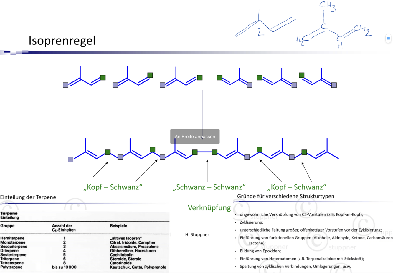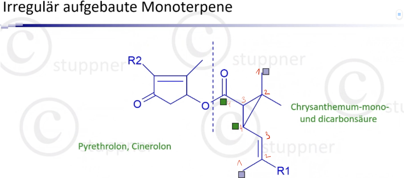 Auf der rechten Seite haben wir einen Monoterpen-Anteil bestehend aus 2 Isopren-Einheiten. Hier sieht man also eine Kopf-Kopf-Verknüpfung! Grau ist Kopf. Dieses ist ein typisches Molekül das irregulär aufgebaut ist.