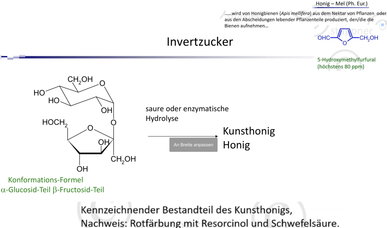 Diese Herstellung des Invertzuckers kann “künstlich” hergestellt werden (saure oder enzymatische Hydrolyse), man Produziert hier.