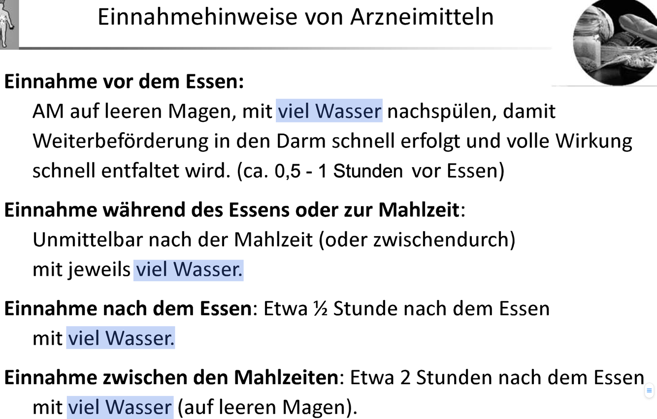 • Meist einnahme mit oder nach Essen gut, da sich so die Wirkung verlängert