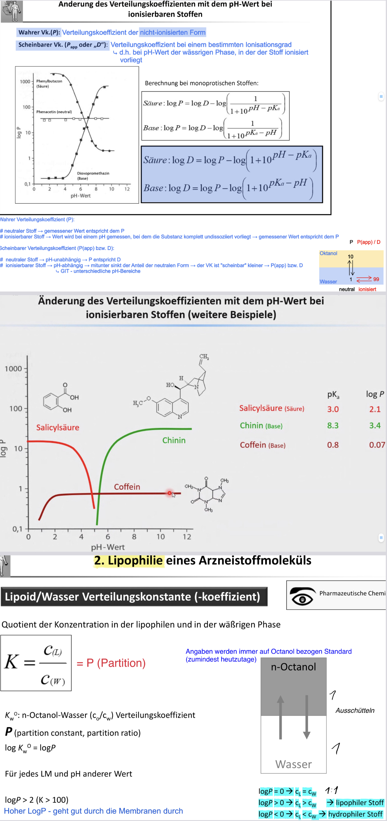 Scheinbaren Verteilungskoeffizient-zusammenhang mit Säure/ Base angeben und Zusammenhang zwischen Octanol/Wasser und Sättigungslöslichkeit