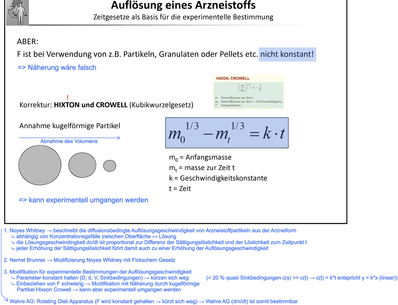 F (Oberfläche des Feststoffen), ist bei Verwendung von z.B Partikeln, Granulaten or Pellets etc. nicht konstant –> Näherung wäre Falsch, daher korektur da die Fläche während dem auflösen kleiner wird.