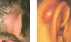 Deslocamento do pavilhão auricular e desaparecimento do sulco retroauricular.