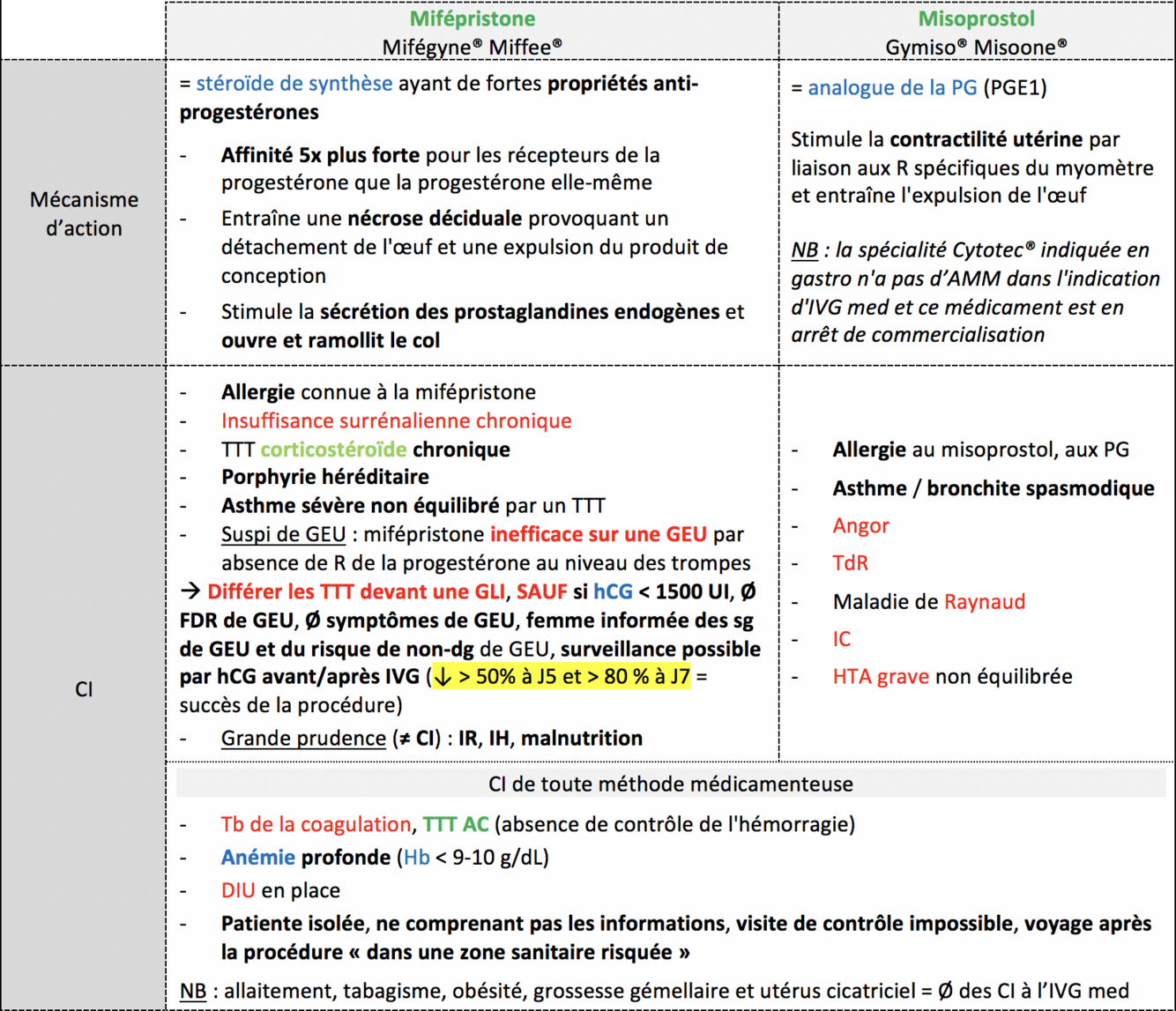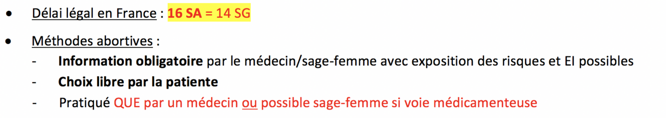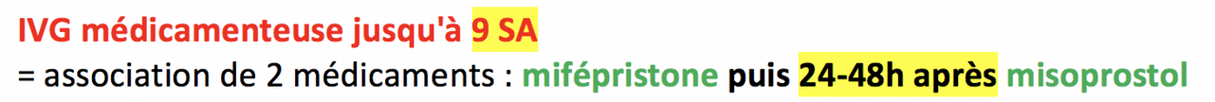 NB pour la méthode instrumentale : mifépristone PO ≈ 36-48h avant l’intervention, et dépistage systématique d’une infection à Chlamydia Trachomatis et Neisseria gonorrheae