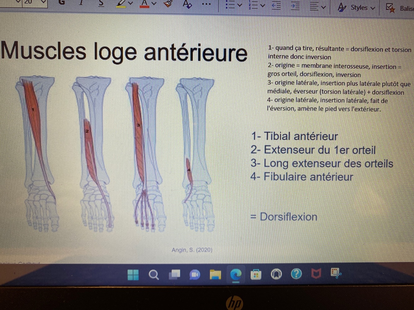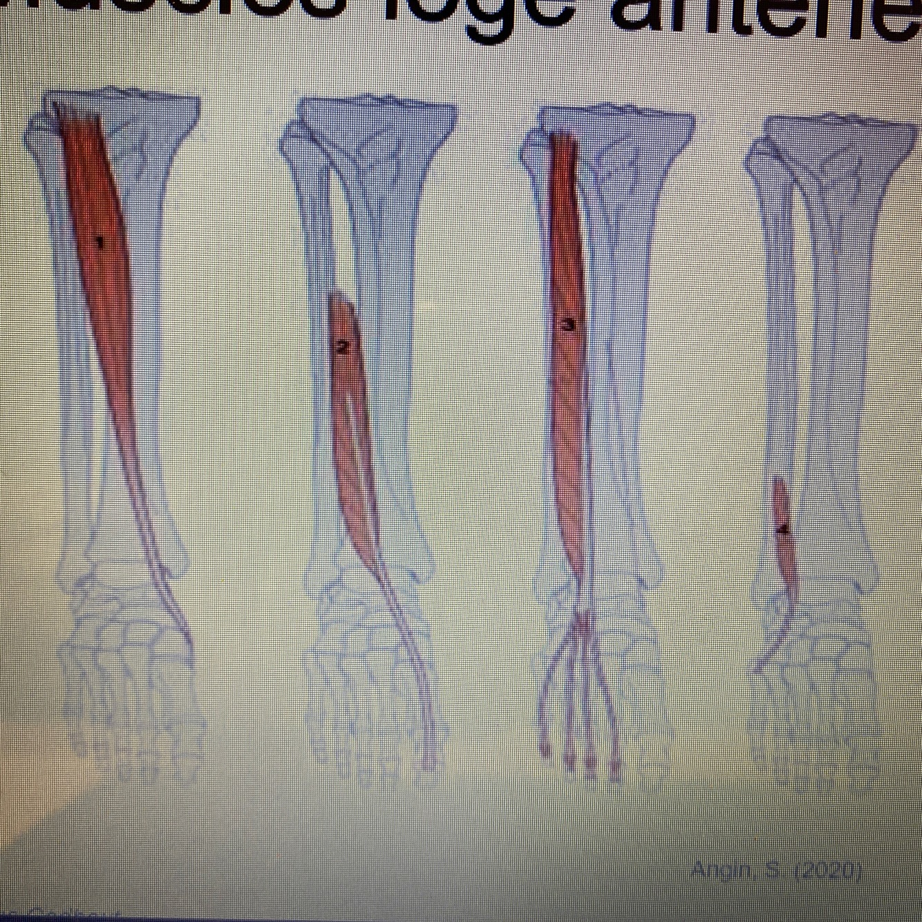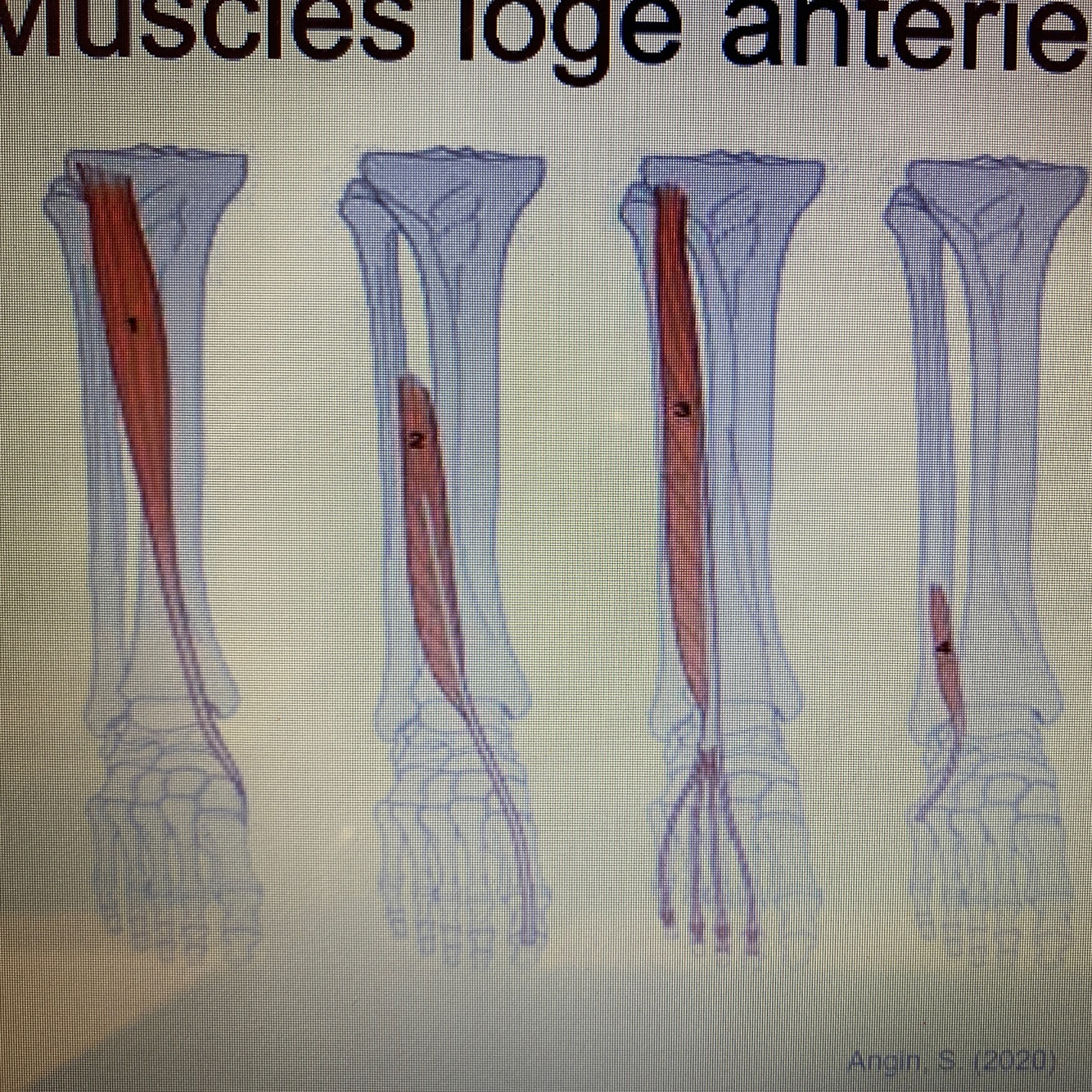 Tibial antérieur, extenseur du 1er orteil, long extenseur des orteils, fibulaire antérieur