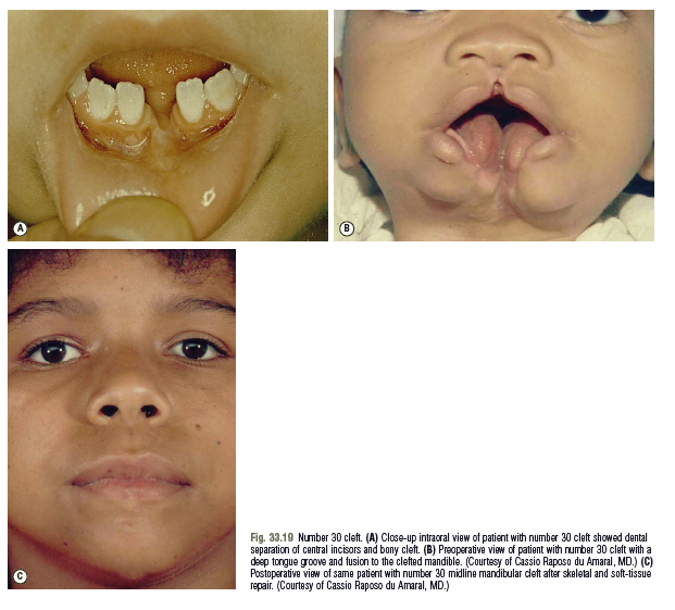 One liner: Mandibular cleft originating between the central incisors and extending inferiorly, yielding notching of the lower lip and a bifid tongue.