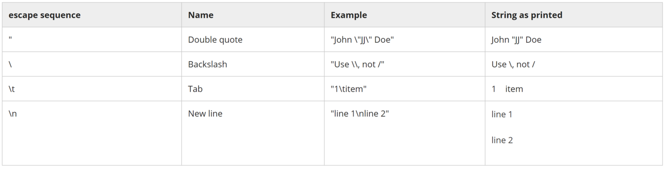 What if you want to create a String that contains a double quote character? Tricky! If you wrote “””, Java would be confused. The computer can’t tell if “”” is an empty String followed by a double quote, or a String consisting of a double quote character. Java includes a way for you to clarify this ambiguity with what is called an “escape sequence”. When Java sees a backslash in a String this tells Java to “escape” or skip the next character’s function and simply add it to the String: