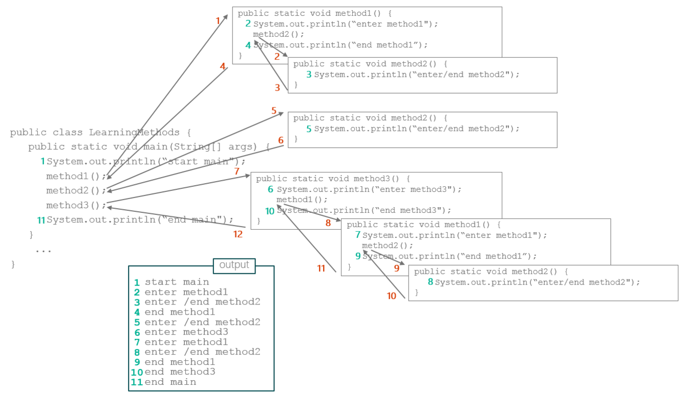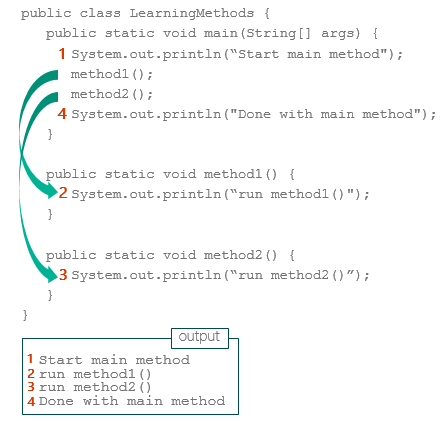 When you call a method, the computer jumps to that method definition, runs all the code inside that method, then returns to the line where it was called.