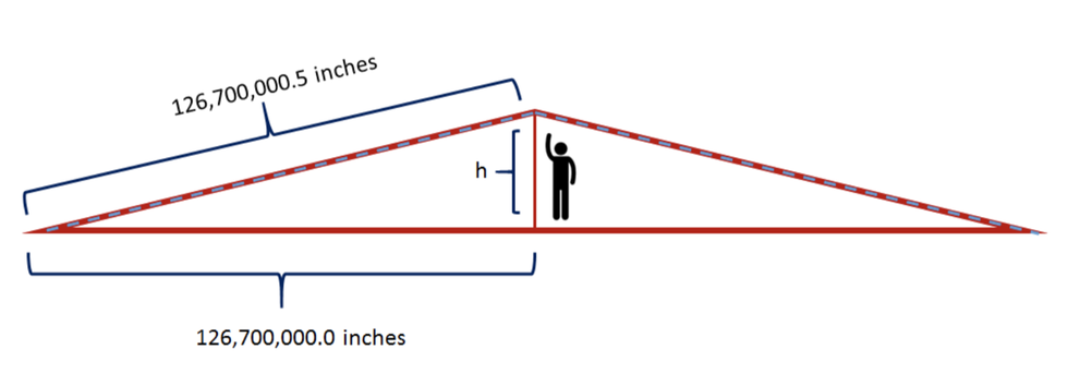 Let’s suppose when the handrail expands, it buckles upward at its weakest point, which is in the center. How much higher will pedestrians in the middle of the country have to reach in summer to grab the handrail? That is, in the figure below, what is h? (For the purposes of this question, ignore the curvature of the Earth and assume the trail is a straight line.)