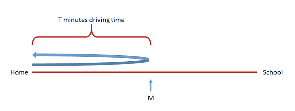 Let’s call the spot at which Amanda and Matt meet on the road, point M. In this problem, Amanda drives from their home to point M, where she picks up Matt, and then drives back to their home. Let’s call the time it takes her to do this “T”.