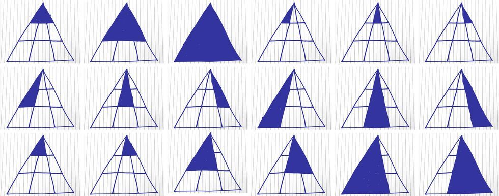 Remember high school math? That’s n(n-1)/2. And since there are p horizontal lines, says Bonahan, this gives p n(n-1)/2 possible triangles. In our case, that’s 3x4(4-1)/ 2=18.