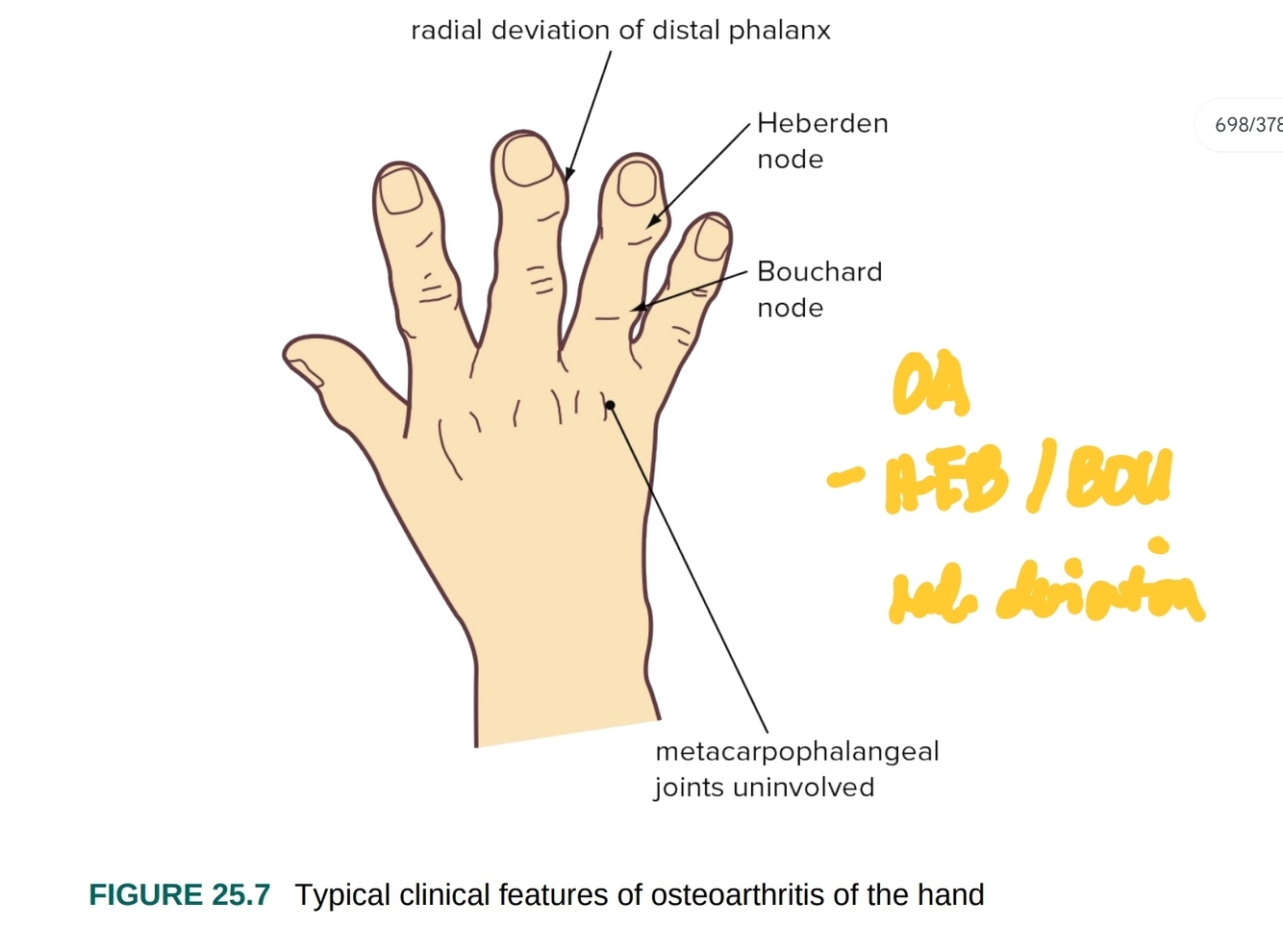 Pain: worse by the end of the day, aggravated by use, relieved by rest, worse in cold and damp